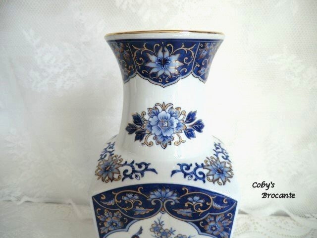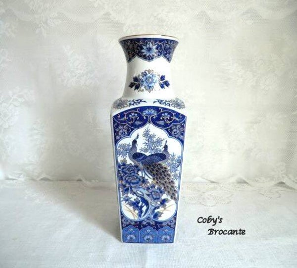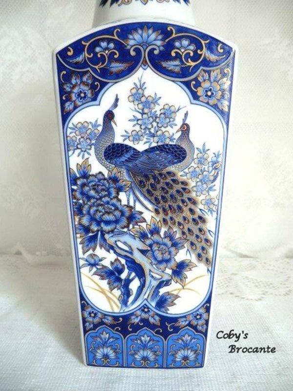 Prachtige vaas met pauwen decor in de kleuren blauw en wit, en met goudkleurige accenten.