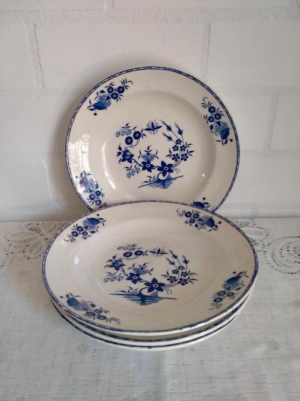 Een ovalen serveerschaal, afmetingen 26 x 36 cm.4 Diepe borden (waarvan 1 een beetje craquelé), diameter 24 cm.