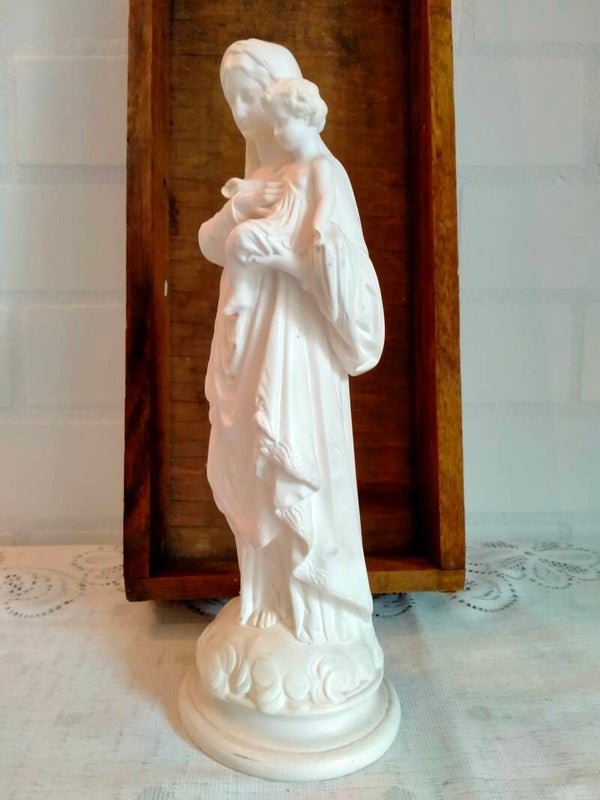 Wit gipsen Mariabeeld met kindje Jezus op haar arm.