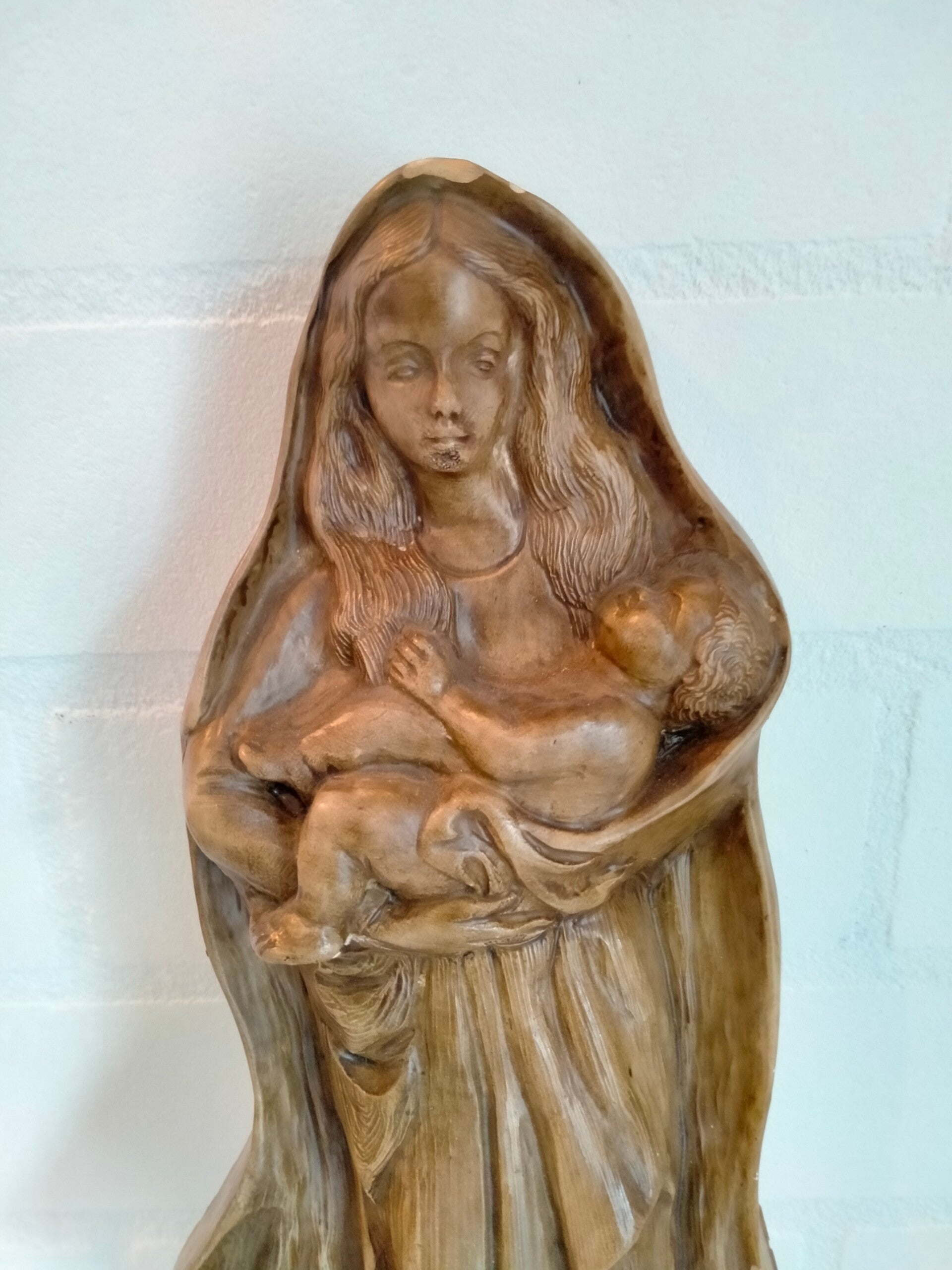 Gipsen Maria muurbeeld met kindje Jezus in haar armen.