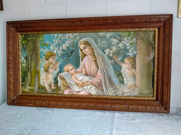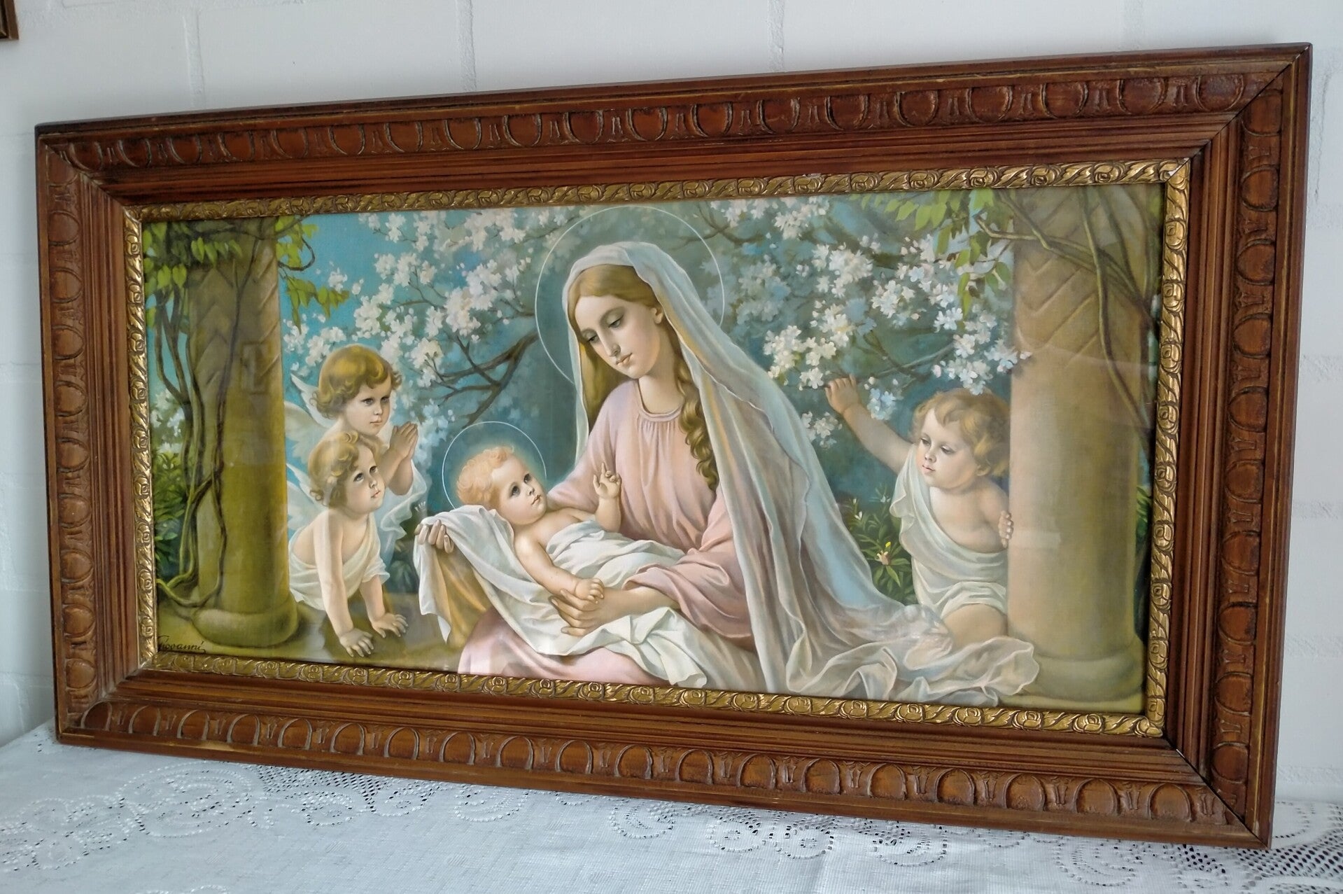 Prachtige grote Maria prent in authentieke houten lijst,de prent is met een glasplaat ervoor.Een prachtige afbeelding van Maria met kindje Jezus enengeltjes er omheen.Afmetingen 89 x 50 cm.