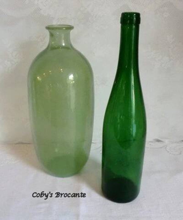 Glazen fles donkergroen, hoogte 33,5 cm.