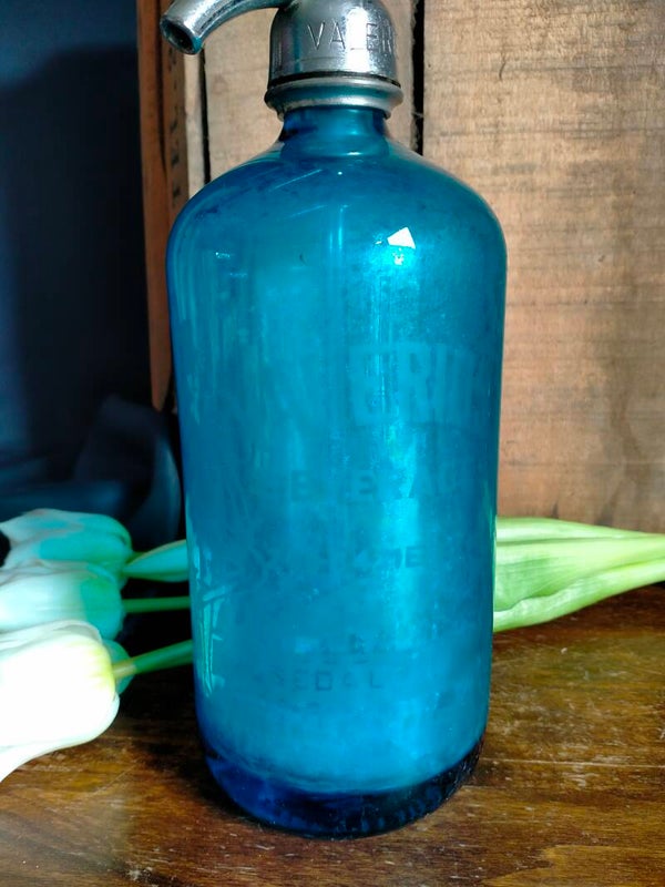 Oude sodafles in een mooie aquablauwe kleur, met etikettering Valerios beverage, en een afbeelding van een mooie dame.