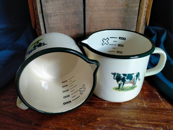 Leuke emaille melkkannetje met een koe, uit de jaren 80.