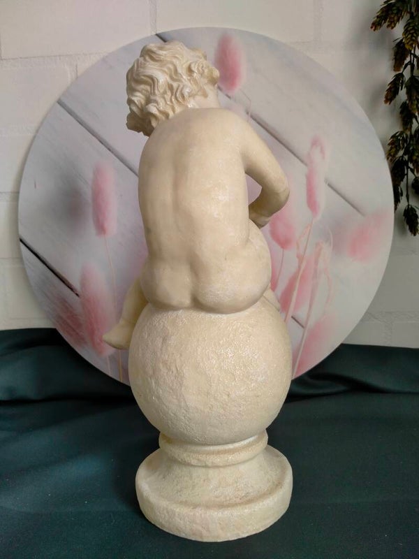Leuke engel zittend op een bol, het beeld is gemaakt van kunststof.