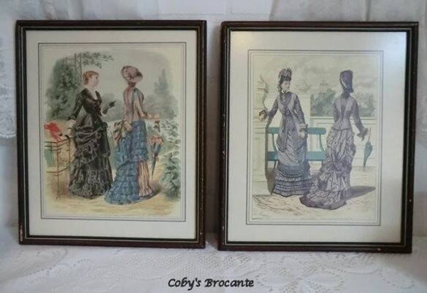 Prachtige Franse modeprent van dames in Victoiraanse kleding.