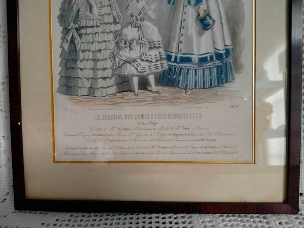 Prachtige Franse modeprent, 2 dames en een kind in Victoriaanse kleding. Met Franse tekst onder de afbeelding.